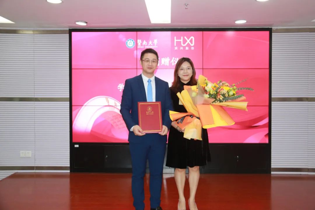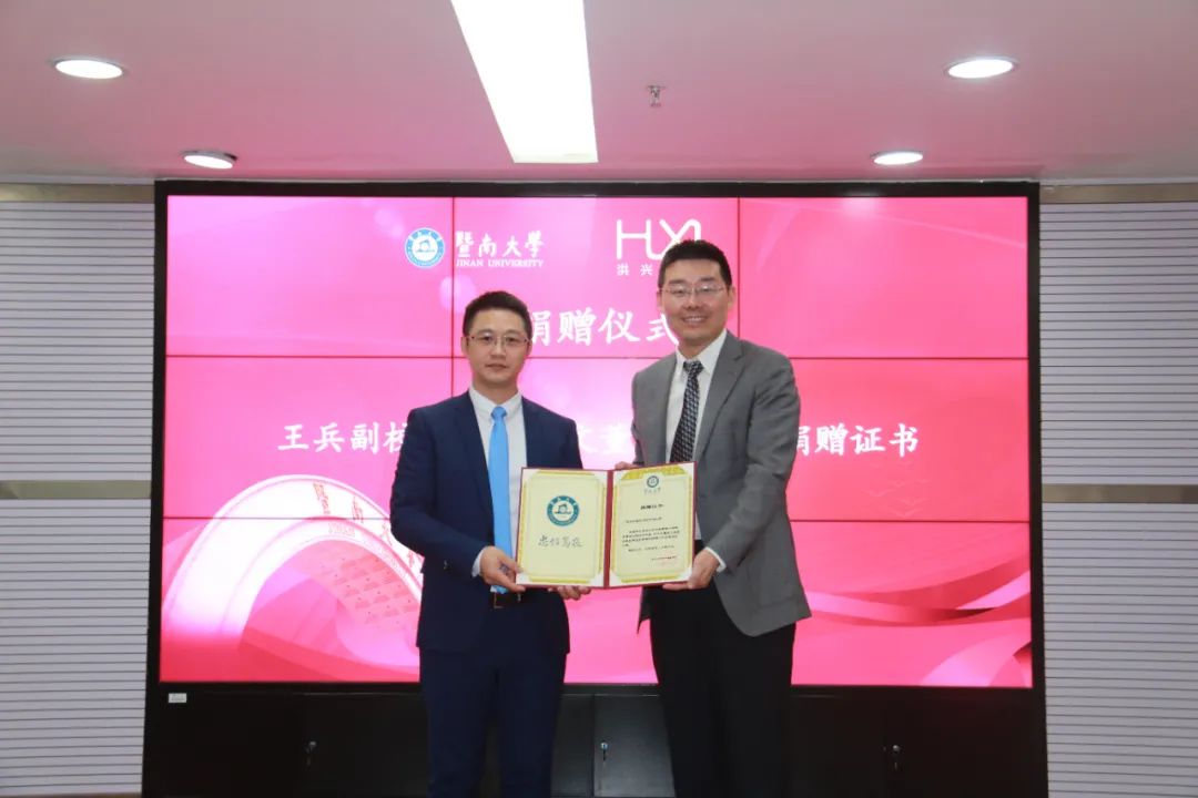捐赠仪式上,王兵代表暨南大学接受郭梧文董事长的捐赠支票,并向其颁发捐赠证书和鲜花。