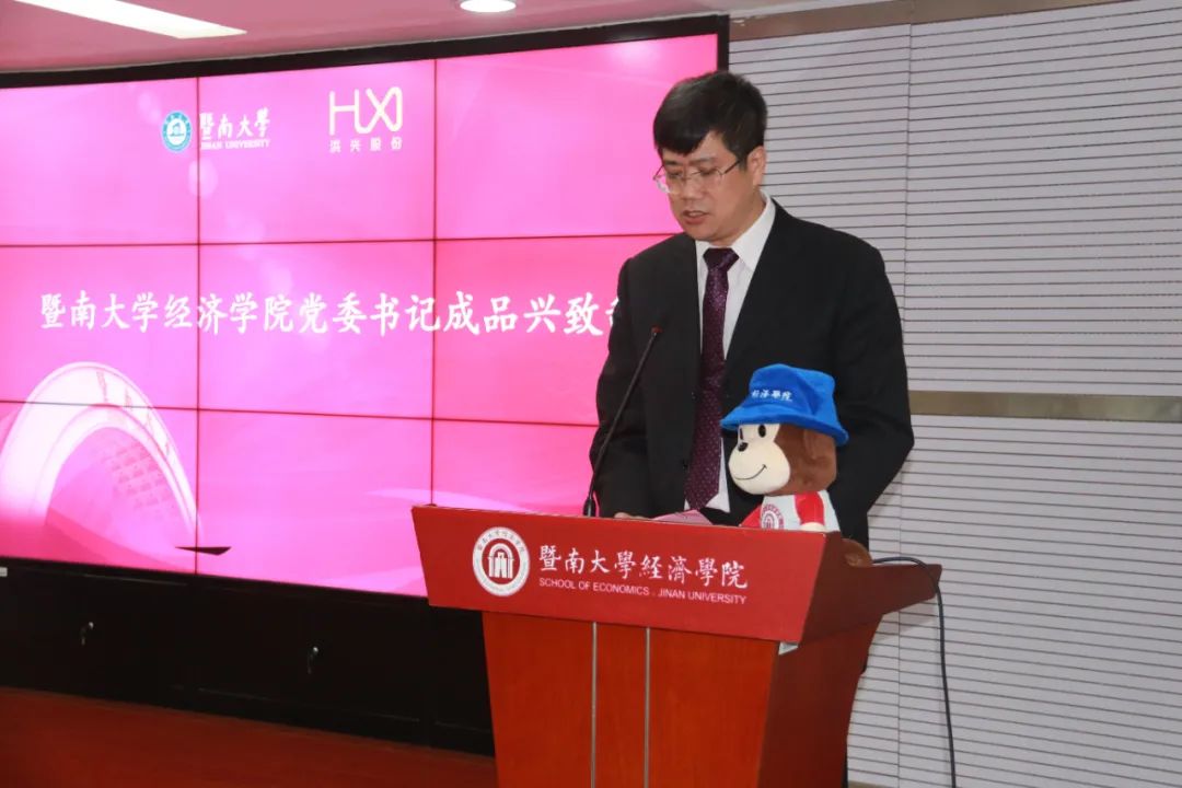 成品兴书记代表公司全体师生诚挚感谢郭梧文董事长对暨南经济学科发展建设的支持。他表示,暨南经济学科发展目标非常明确:从高原攀登高峰,冲击“国际一流经济学科”方阵。为实现这一目标,当务之急是加强人才引进和培育,建立一流的教师队伍。今天,年轻有为的郭梧文董事长慷慨解囊,为暨南经济学科人才基金捐助100万,这为公司早日实现目标增添了更大的信心和动力。