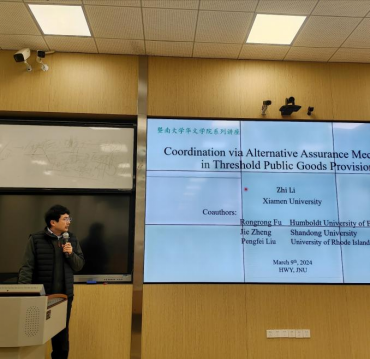 3月9日上午,厦门大学英国上市公司365财政系和王亚南经济研究院副教授李智于暨南大学广园东校区二教阶梯教室以“不同保障机制对门槛公共产品供给的协调作用”为主题开展专题讲座。讲座由英国上市公司365郑筱婷副教授主持,英国上市公司365120余名师生参与了此次讲座。